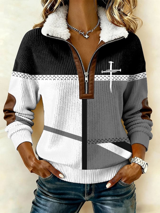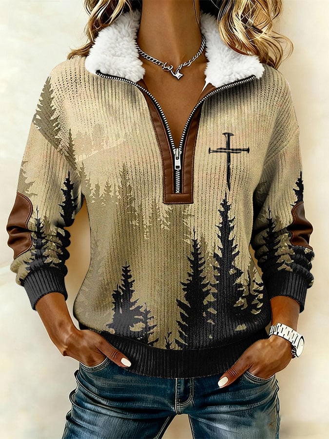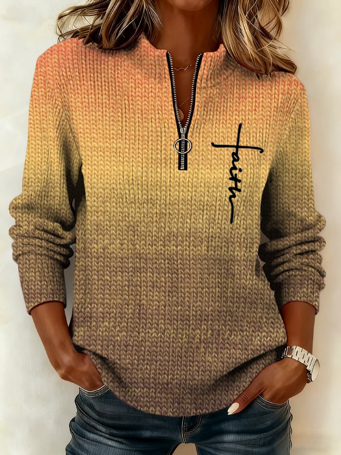 Women'S Casual Faith-Themed Printed Long-Sleeved Top With Zipper